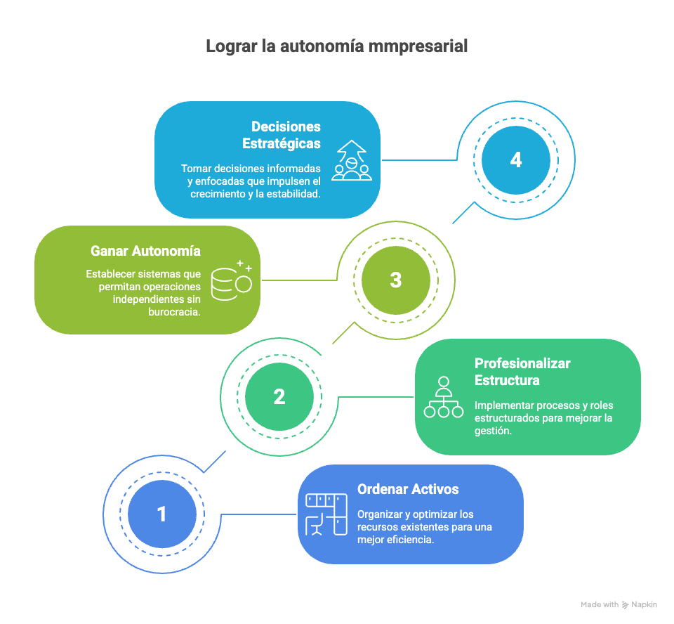 Profesionalizar la empresa: construir una estructura operativa sólida, con roles claros, procesos definidos, visión estratégica y autonomía real del equipo.